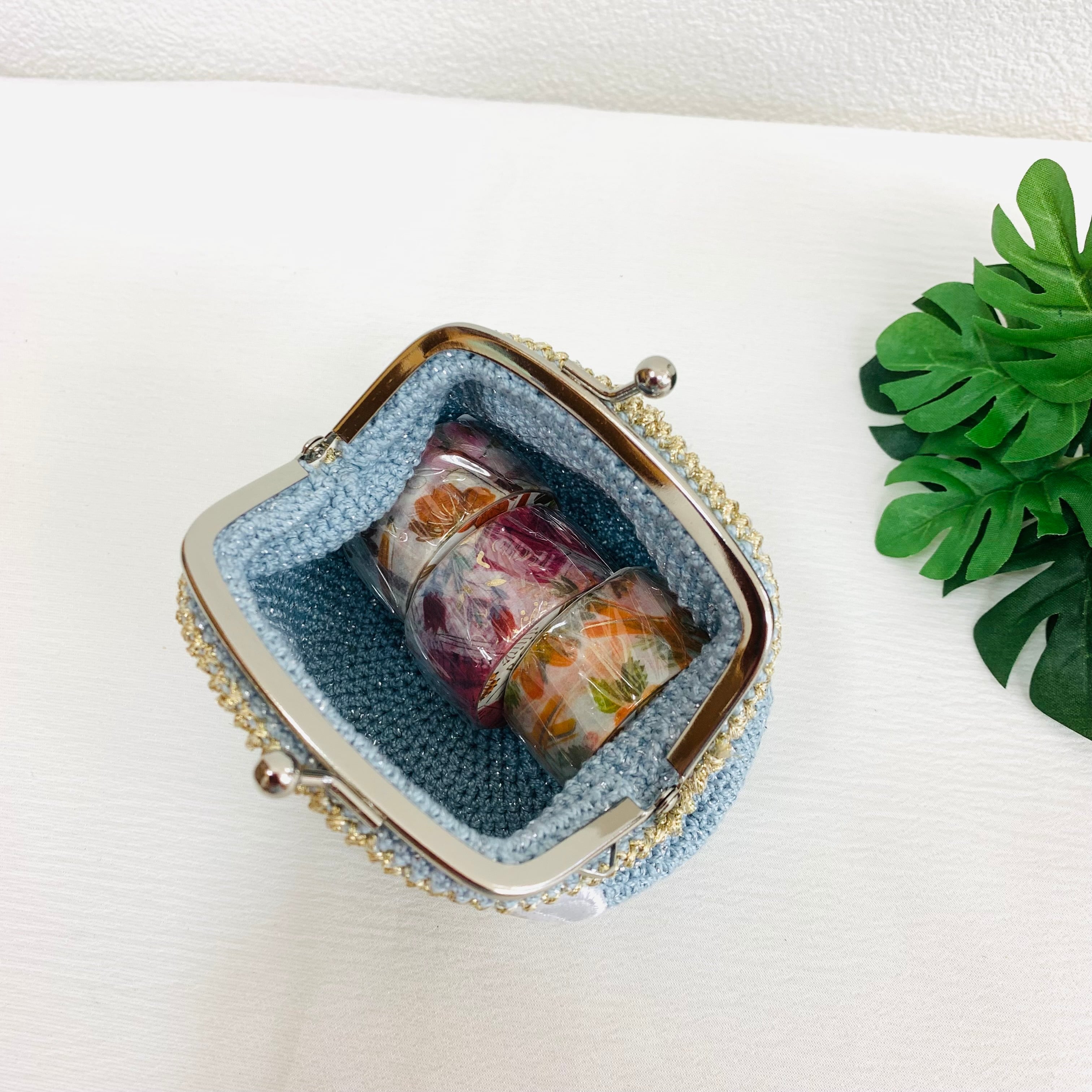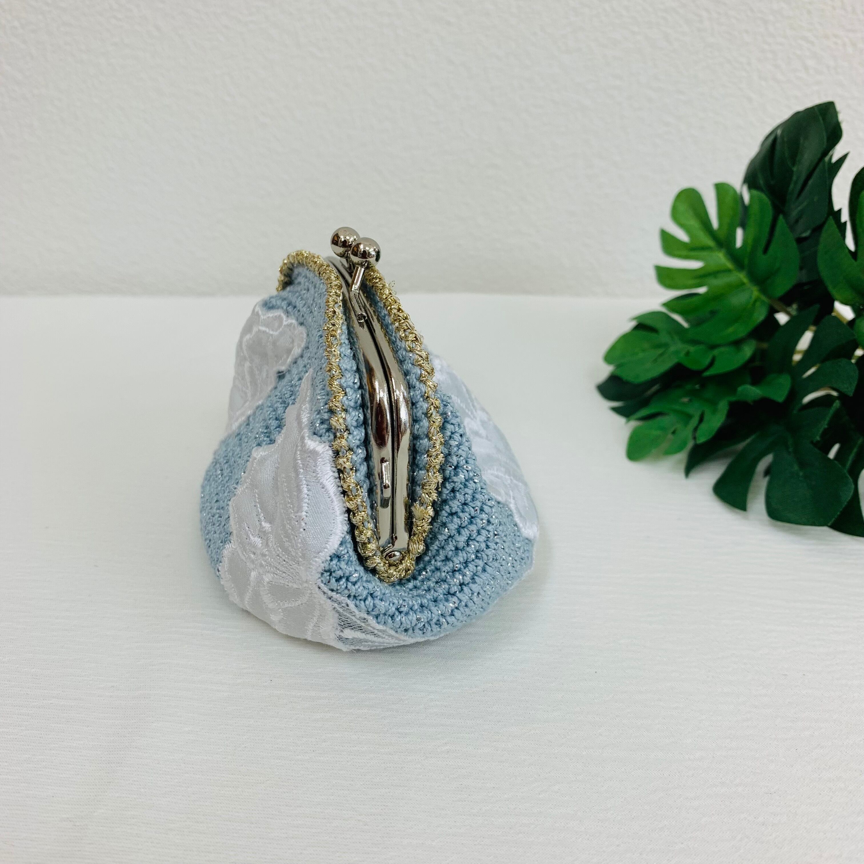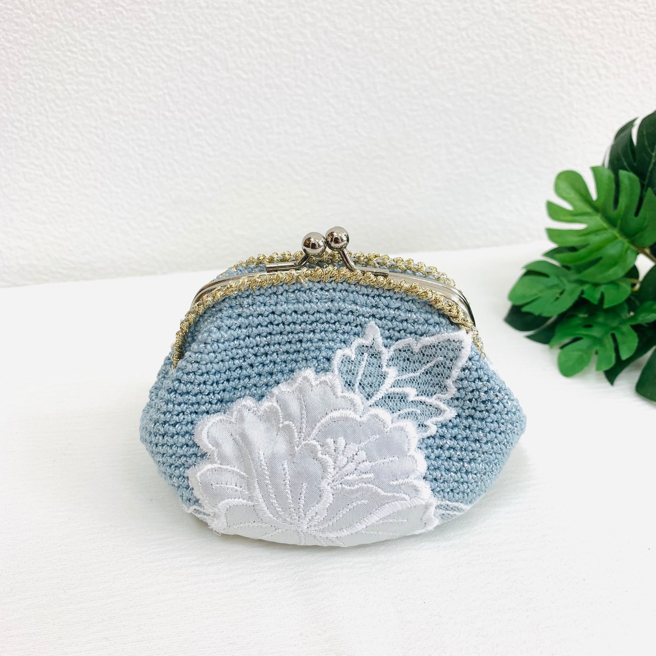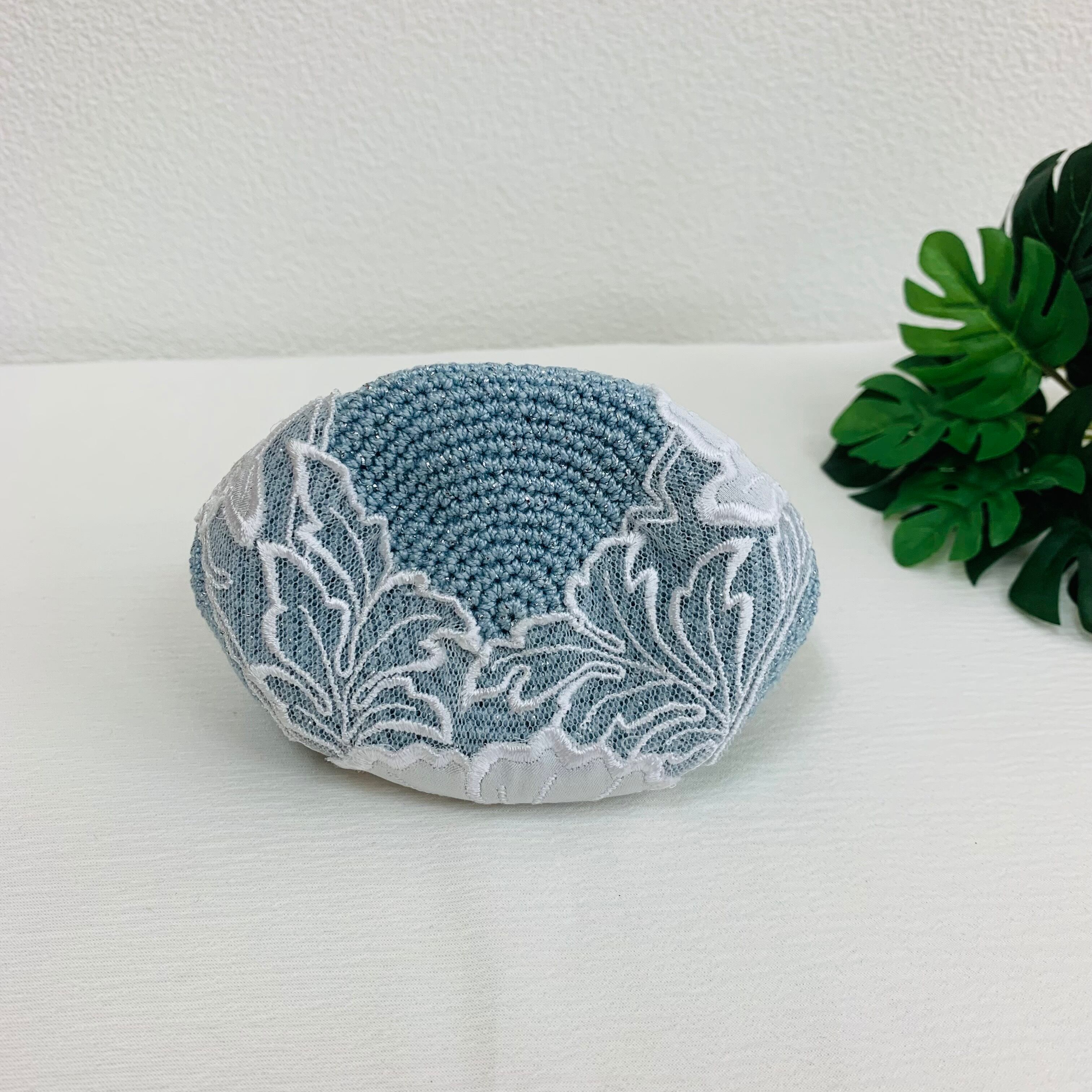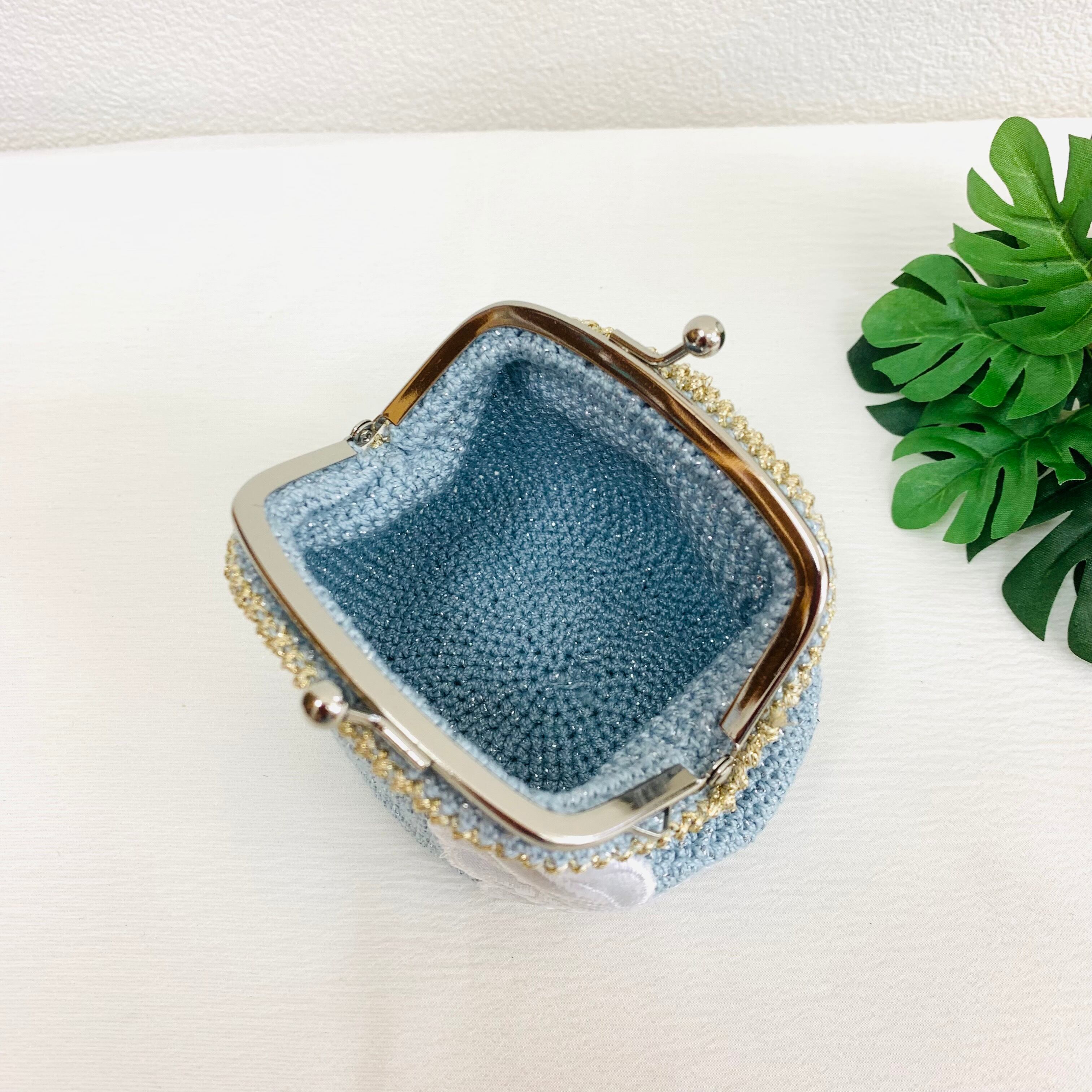ブルーのコットンヤーンにラメ入りヤーンを混ぜて編んであります。