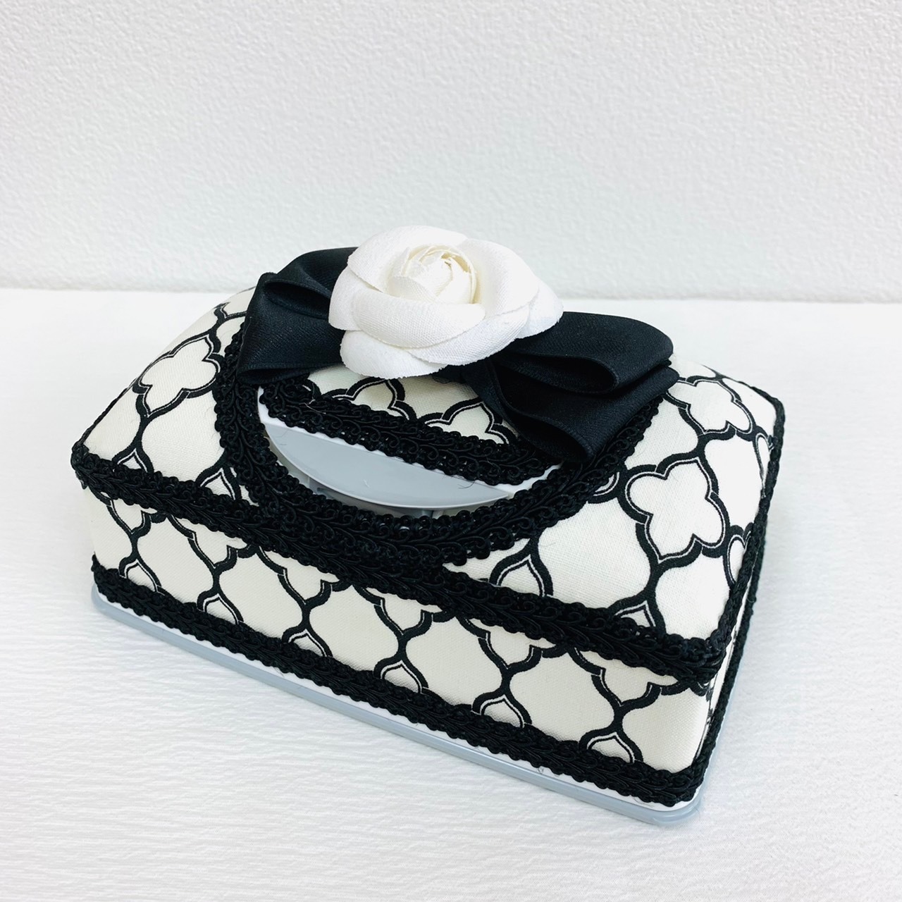 モロッカン生地に黒リボン 白のカメリア