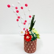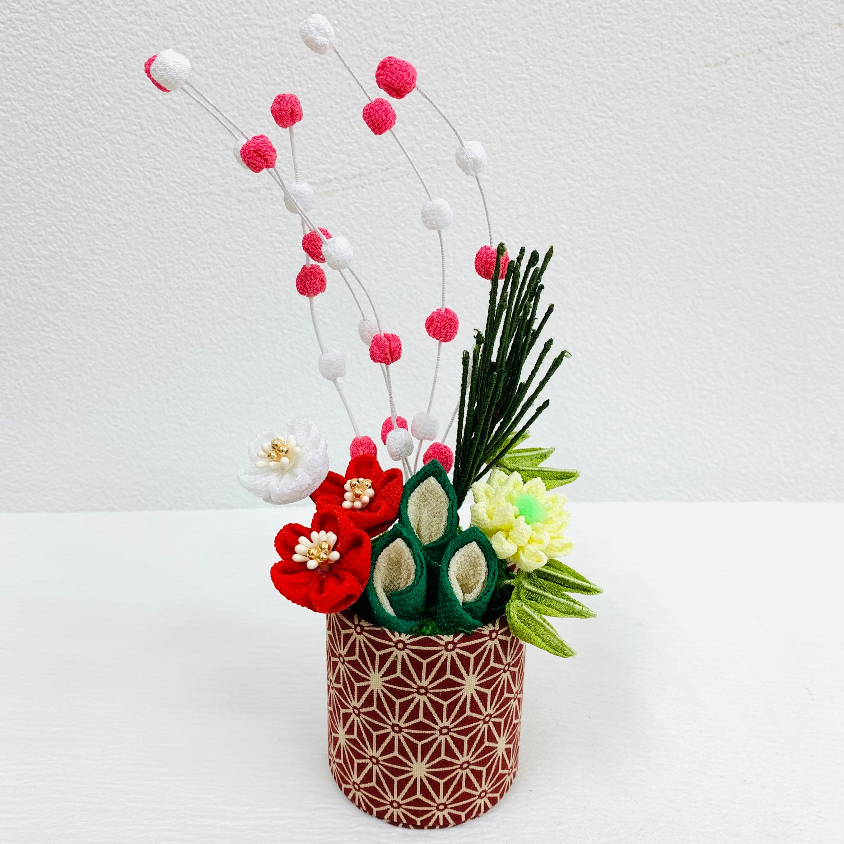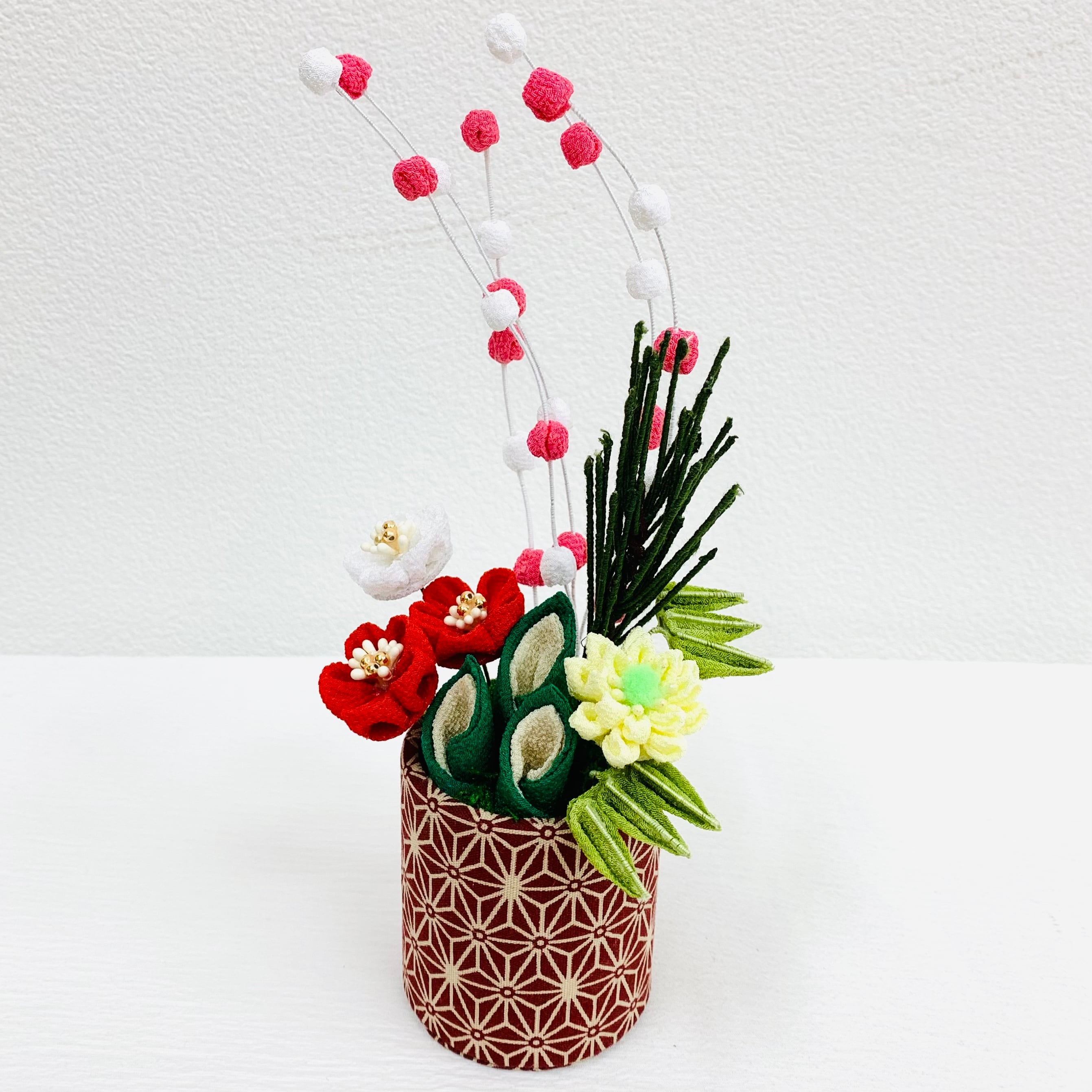 松葉はワイヤーに一本一本糸を巻いてあります。足元にはグリーンモスをあしらってあります。